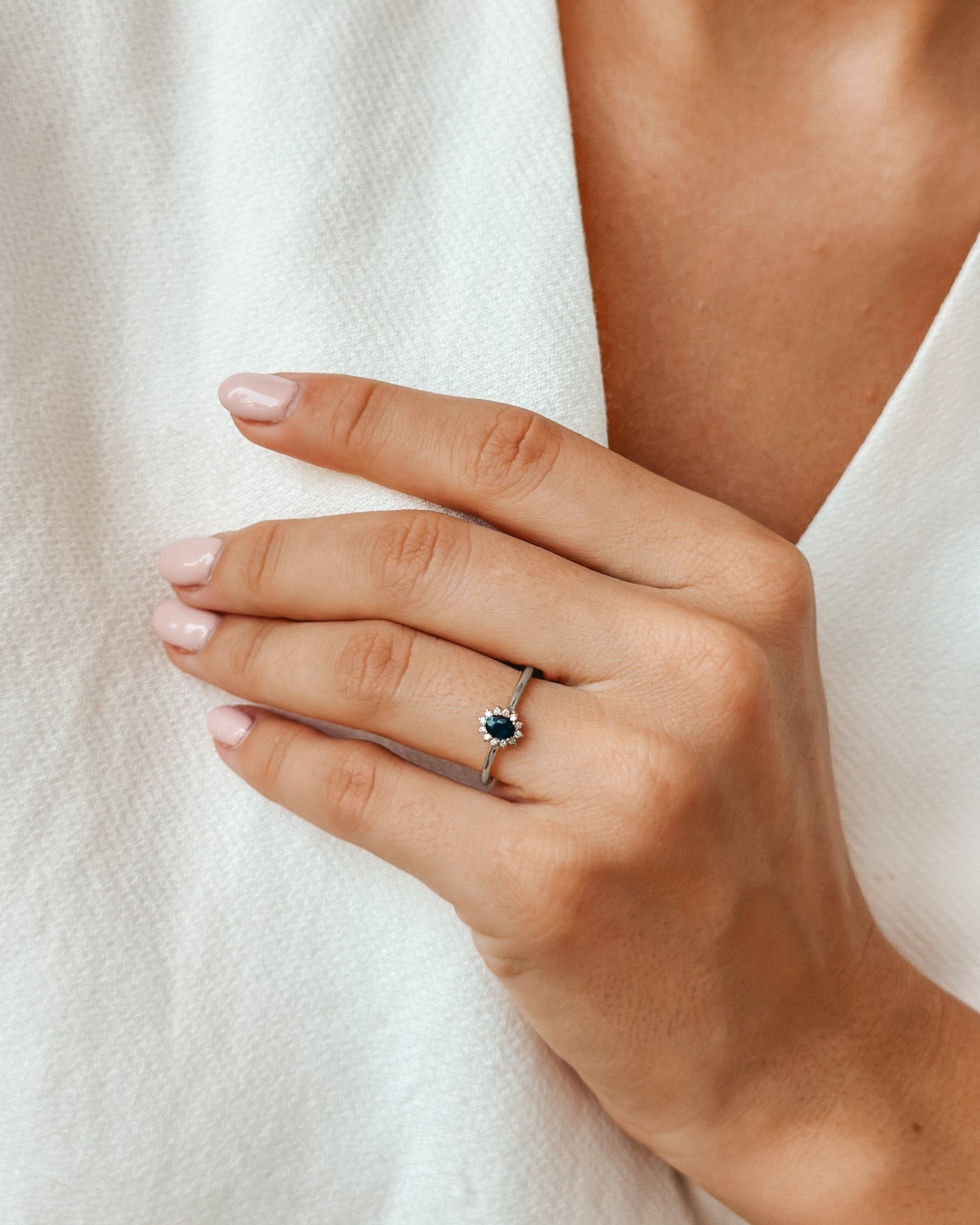 Класически пръстен с кралски акцент, изработен от 14K бяло злато и украсен с интензивен овален сапфир, заобиколен от кръгли диаманти с общо тегло 0.06 ct