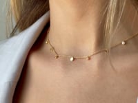 Колие с висулки от бял топаз с размер 2.5 мм и сребърни монети с размер 2.5 мм, редуващи се, с дължина 36 см, удължимо до 40 см.