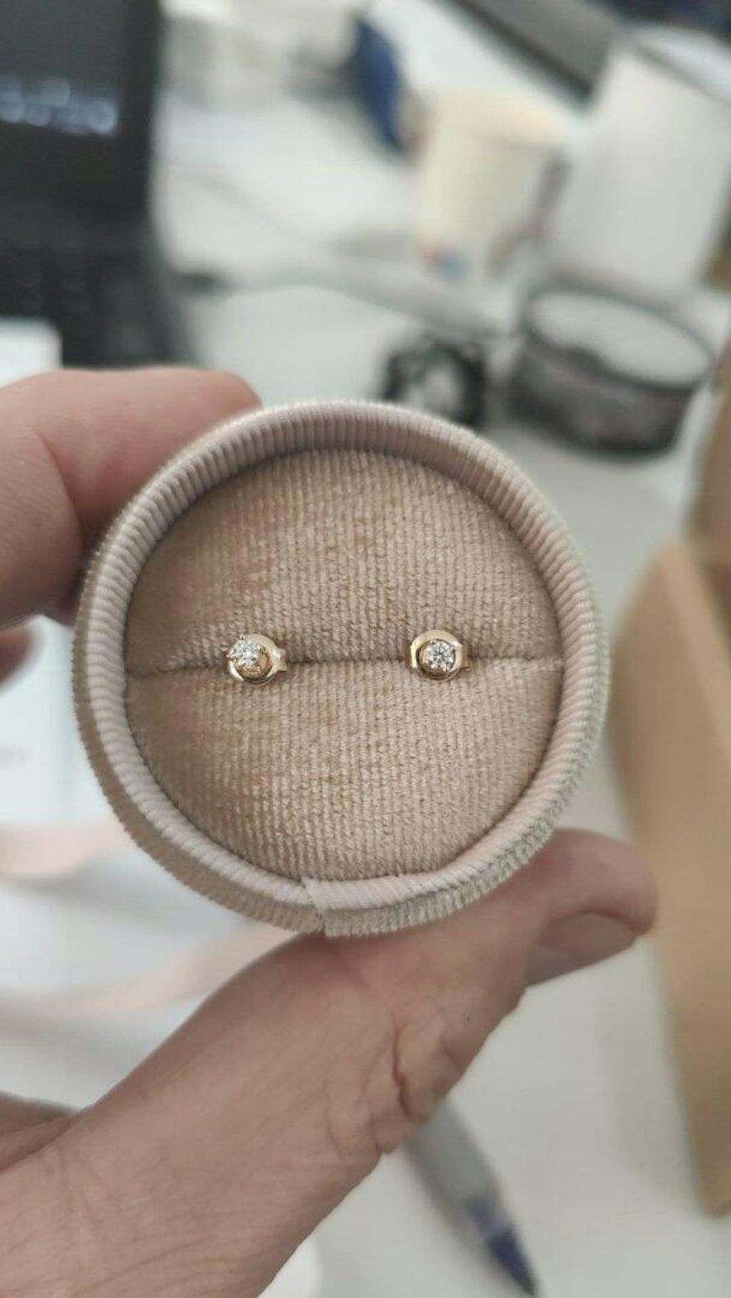 14K златото осигурява издръжливост и дълготраен блясък, докато класическата 4-зъбна настройка позволява светлината да влиза от всички ъгли, подчертавайки блясъка на диаманта. Системата с пеперуден захват предлага комфорт и сигурност през целия ден.